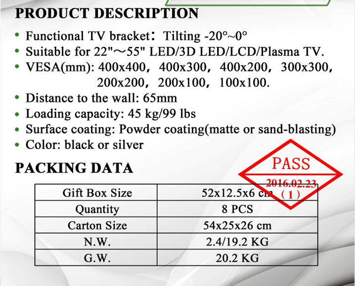 Giá treo tivi đa năng nhập khẩu mã BB5244 Loại này có thể treo tivi từ 22-55 inch dùng được cho tất cả các dòng tivi từ LCD, LED , UHD cho đến những đời máy mới nhất ,chất liệu sắt dày , được tôi và sử lý chống gỉ sét bong tróc với sơn tĩnh điện công nghệ cao mới nhất , bảo đảm độ bền và vẻ đẹp thẩm mỹ tuyệt vời cho phòng khách cũng như phòng ngủ , văn phòng ,nhà hàng khách sạn hình ảnh và video cũng không tả hết được vì vậy xin mời quý khách trải nghiệm thực tế ạ.