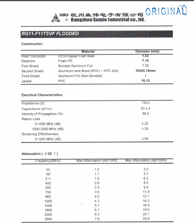 (1.63mm CCS +FPE 7.15mm+Bonded Alumium foil+ 16*6*0.16mm Alumium wire braid 60% coverage+APD jelly flooded+APA foil+PVC 10.15mm ) Impedace: 75ohm+/-3