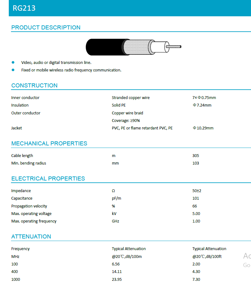7x0.75mmCu+7.24mmSPE+192x0.16mmCopper Braid(93%)+ đường kính 10.30mmPVC, nhựa màu đen trở kháng : 50ohm