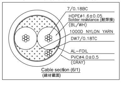 thông số (7/0.18BC+XLPE1.6)*2C+NYLON+ lớp tiếp mát 7/0.18 đồng tráng thiếc +lá nhôm + đường kính: 4.0MM