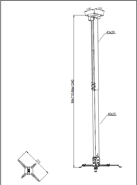 Giá máy chiếu SM70120. Độ cao có thể điều chỉnh từ 71-124cm. Kích thước thân: 43x28mm.Sắt sơn tĩnh điện. Trọng lượng 2.1kg