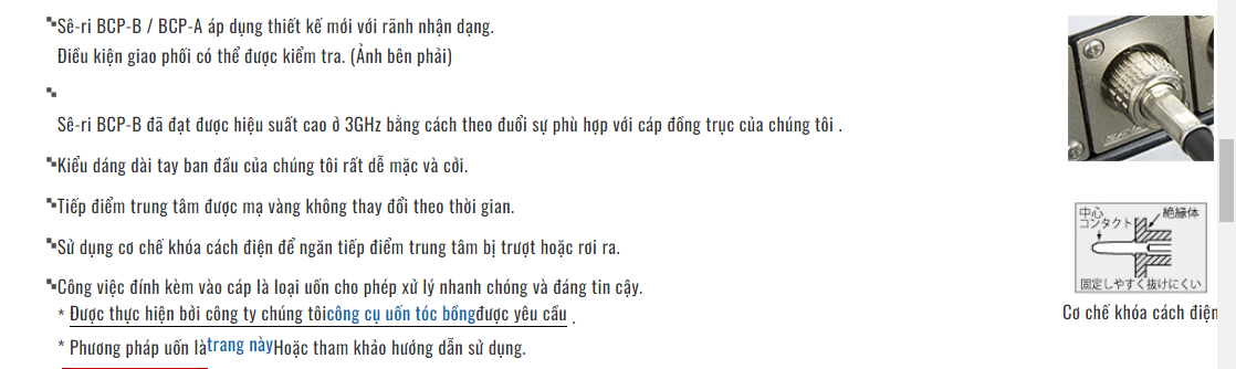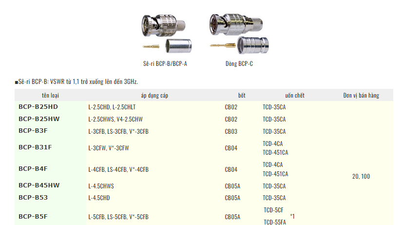 Jack BNC cho tín hiệu Video SDI dây RG58. VSWR từ 1,1 trở xuống lên đến 3GHz. Sê-ri BCP-B áp dụng thiết kế mới với rãnh nhận dạng.Điều kiện tiếp xúc có thể được kiểm tra.